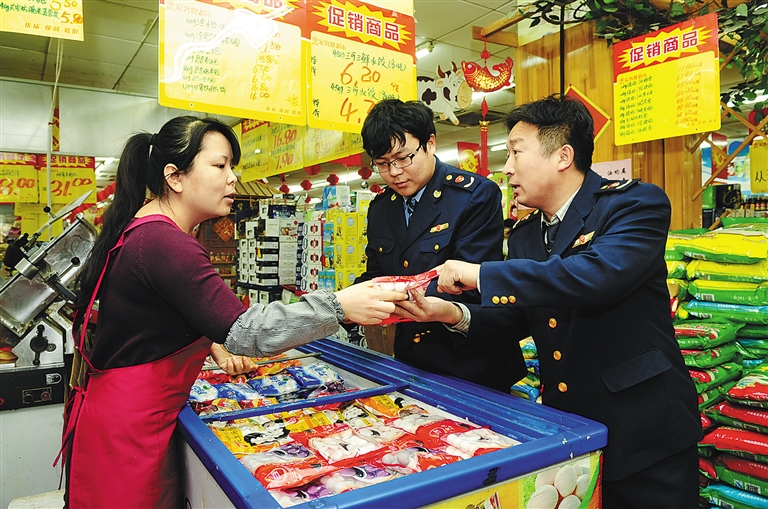 3月3日,河北沧州市新华区工商分局执法人员在对一家超市销售的元宵进行检查。 元宵节临近,河北省沧州市新华区工商分局组织执法人员,对辖区内超市、摊点销售的元宵、汤圆食品进行检查,以提醒元宵、汤圆的生产和经营单位加强自律,让广大消费者吃上“放心元宵”。 新华社记者 牟宇 摄