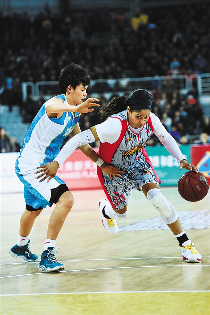3月3日,在中国女子篮球联赛(WCBA)总决赛第三场比赛中,山西队主场76:65战胜北京队。图为山西队玛雅·摩尔(右)在比赛中运球突破。 新华社发