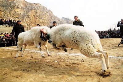 人们根据羊的齿龄、体重分等级配对进行角逐,场面甚是壮观,扣人心弦。只见两只羊四目怒视,主人一声“上”,两只羊猛地发力冲向对方,硬硬的头“砰”地撞在一起,之后各自又倒退至原位,又闪电般前冲,如此反复 ,直到一方不愿向对方攻击为止。女儿担心地问身边一位老乡:“羊儿这样剧烈冲撞,会不会得脑震荡呀?”老乡连忙解释说:“两只羊相撞瞬间力度确实非常大,但一般不会有致命伤害。”另一位老乡也插话说:“你们看,有的羊虽然也挂彩了,但还是那么有气势,这就是俺们山东的斗羊。”