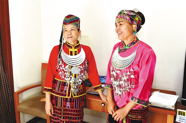 3月3日,全国两会召开前夕,我省代表积极准备、认真履职。图为来自基层的两位少数民族代表黄月芳(左)和林美娟。