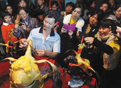 去年的肥鸡赛,乐城人马振秋早早就将煮好的肥鸡端到家门口,盛在铺着红绒布、装了转盘的桌子上。近17斤重的硕大肥鸡色泽金黄,身体饱满,嘴含红花,脖子上特意留下一圈毛如同项链,翅膀上的羽毛更显威武神气。马振秋家的肥鸡一亮相,里三层外三层的村民和游客惊叹之余,纷纷拿起相机手机争相拍照,这只肥鸡也当仁不让地成为去年肥鸡赛的冠军!