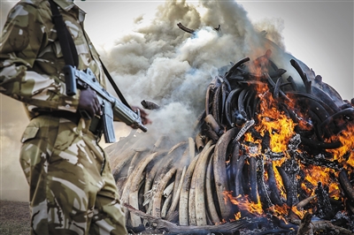 3月3日,在肯尼亚内罗毕国家公园,一名肯尼亚野生动物保护局人员在焚毁走私象牙现场警戒。 在2015年“世界野生动植物日”到来之际,肯尼亚总统乌胡鲁·肯雅塔当日在内罗毕国家公园点火焚毁了15吨走私象牙,并称国际社会在抵制野生动植物走私方面已达成共识,肯尼亚继续加强合作,减少非法象牙交易。 新华社记者 潘思危 摄