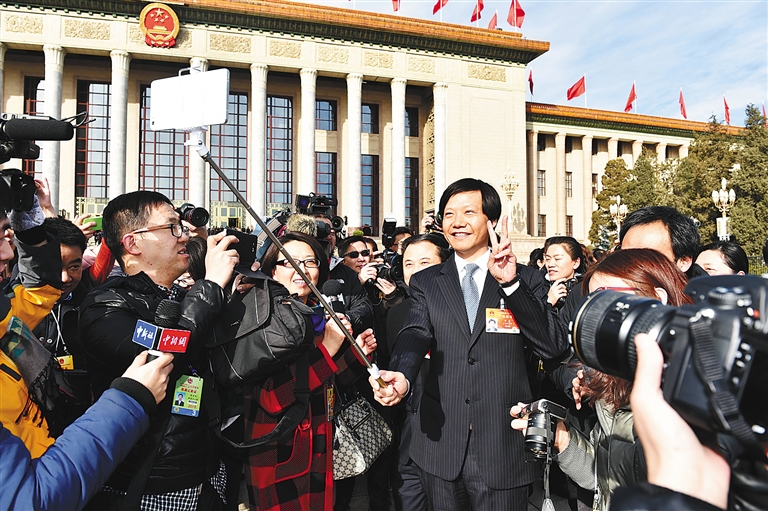 3月4日,北京天安门广场,小米科技创始人、董事长兼首席执行官雷军用小米手机玩起自拍,瞬间被媒体记者包围,赚足了眼球。