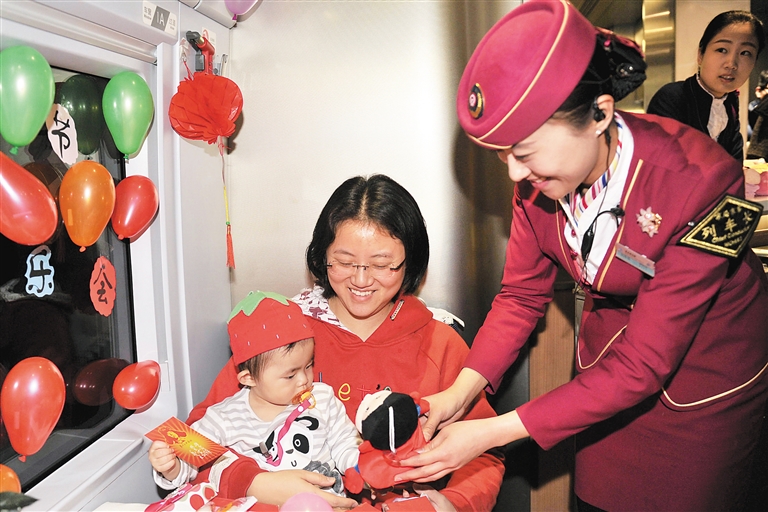 3月5日,列车长侯砚硕(右)在G41次列车上为猜灯谜的旅客送上小礼品。 当日是学雷锋日和元宵节,北京铁路客运段高铁一队在所值乘的列车上举行“弘扬雷锋精神,共建文明家园”主题活动,通过播放学雷锋专题广播、送胸章、猜灯谜等活动学雷锋,度佳节。