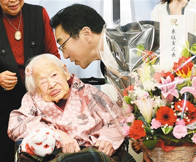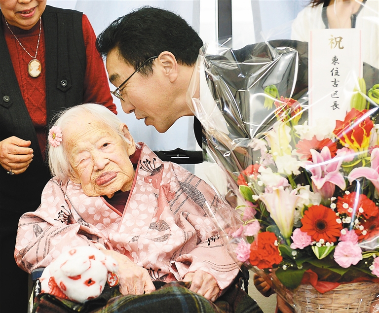 3月4日,在日本大阪,世界最长寿在世老人大川美佐绪(左)在养老院庆祝生日。 当日,世界最长寿在世老人大川美佐绪提前庆祝生日。她在今年3月5日满117岁。 新华社/路透