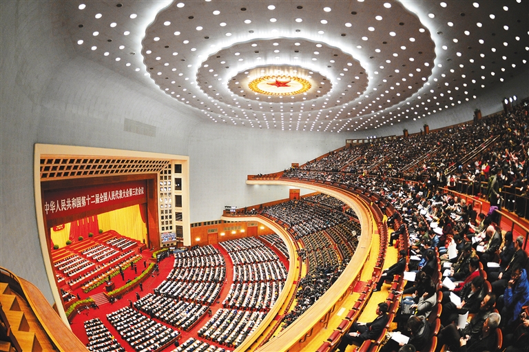 上午9时,张德江宣布:中华人民共和国第十二届全国人民代表大会第三次会议开幕。会场全体起立,高唱国歌。