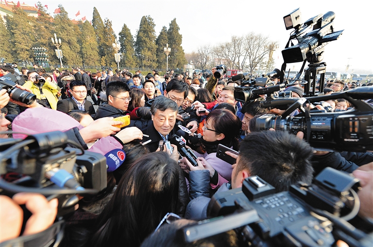 3月5日,两会期间的天安门广场成了各路媒体的采访战场。记者围追堵截代表、委员的“大戏”又开始精彩上演。图为全国人大代表、娃哈哈集团董事长兼总经理宗庆后被记者围得水泄不通。本报特派记者 王凯 摄
