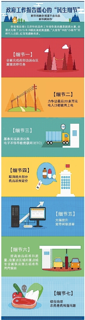 新农村建设要惠及广大农民。突出加强水和路的建设,今年再解决6000万农村人口饮水安全问题,新建改建农村公路20万公里,全面完成西部边远山区溜索改桥任务。力争让最后20多万无电人口都能用上电。以垃圾、污水为重点加强环境治理,建设美丽宜居乡村。多渠道促进农民增收,保持城乡居民收入差距缩小势头。持续打好扶贫攻坚战,深入推进集中连片特困地区扶贫开发,实施精准扶贫、精准脱贫。难度再大,今年也要再减少农村贫困人口1000万人以上。