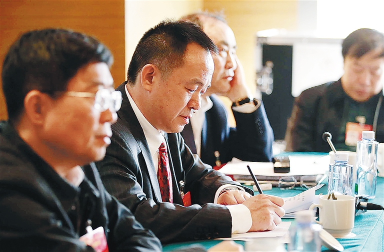 3月5日,全国政协十二届三次会议的分组讨论中,住琼全国政协委员施耀忠(左二)在会场认真记录。 本报特派记者 张杰 摄