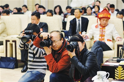 距离海南团开放日活动时间还有半个小时,人民大会堂海南厅就已是一片热闹景象——摄像机、照相机准备就绪,笔记本、录音笔一字排开,来自中外72家媒体的112名记者正摩拳擦掌,力争赢得宝贵的提问机会……