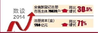 省工商局党组书记、局长陈楷说,去年,新登记注册企业主要集中在0-50万元、50-100万元和100-1000万元三个规模段,分别占新登记企业数量的比例为 14.93%、26.95%和39.44%,这种中小型规模段的企业合计占新登记企业总量的81.32%;与此同时,去年新登记注册资本3万元以下企业206户,注册资本1亿元以上企业245户,上述数据显示,商事制度改革激发大众创业热情,但没有出现盲目认缴注册资本现象,说明大众创业是理性的。