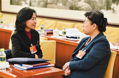 左图 3月7日,会议间隙钟春燕(左)和吕薇两位女代表就有关农村留守妇女等问题交流看法。
