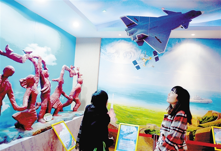 3月8日,人们在“中国梦”文化馆内参观歼-20战斗机模型。 当日,由中国教育策划学术研究会设立的“中国梦”文化馆在北京通州区于家务中学开馆。文化馆分为“命运抗争”、“大国崛起”、“梦之路”三个部分,以实物和照片的形式展示了华夏儿女实现中国梦的奋斗历程。