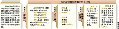 “法治”在中国的热度在过去的四年时间里得到的关注度越来越高。根据百度提供的搜索指数变化图表,“法治”一词在2014年十八届四中全会召开前后的搜索规模达到了峰值,全面推进依法治国战略的提出掀起了人们对法治国家建设的高度关注。