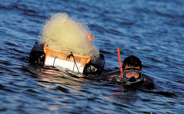 “有时伸手能抓到的鱼,就迅速判断位置,快速徒手把它抓起来,放进网袋。”韦昌清说,潜水捕捞,几乎凭的都是经验的积累,以抓石头鱼、龙虾、海参、鹦鹉鱼为主,有徒手抓鱼、鱼箭刺鱼和鱼钩钩鱼3种方法。当鱼在海里游但距人较远时,就拿鱼箭快速用力一插;当鱼在石缝里偷偷休息时,就拿鱼钩一钩,把它拉出来。
