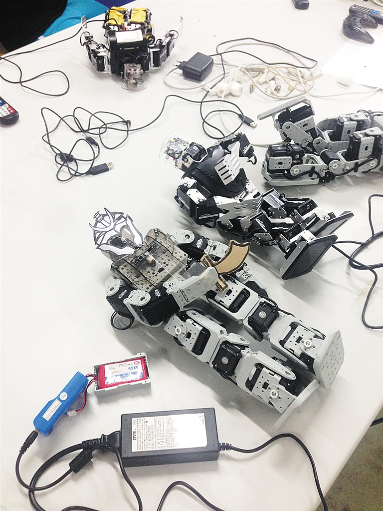 表演当天,郝任之他们没来得及吃午饭也没有睡觉,而是在体育馆里一遍一遍地调试动作。“别人都已经编得挺好的了,我们的动作太复杂,很容易出错。”郝任之说,就怕机器人摔倒。摔倒是因为动作的重心没有设计好,有时候动作与动作的衔接不好也容易摔跤,就需要重新设定动作,一遍遍的重新试,还要考虑不同的场地因素。地面滑不滑,平不平都会影响机器人的发挥。