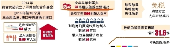 去年我省发起设立了亚洲邮轮合作基金,去年前10个月,三亚凤凰岛、海口秀英港两个港口进出港邮轮156艘次,出入境旅客18.96万人次,同比增长91.4%;推动婚庆旅游经济发展,全年共策划举办23场婚庆旅游主题活动,吸引了近1500对新人参与,到海南拍摄婚纱照的新人更超过20万对,带来的直接经济收益就超过20亿元。