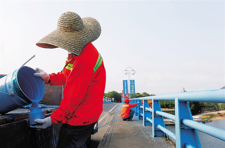 3月6日,琼海公路局的工作人员在博鳌镇大乐特大桥,给大桥护栏喷涂防护油漆。