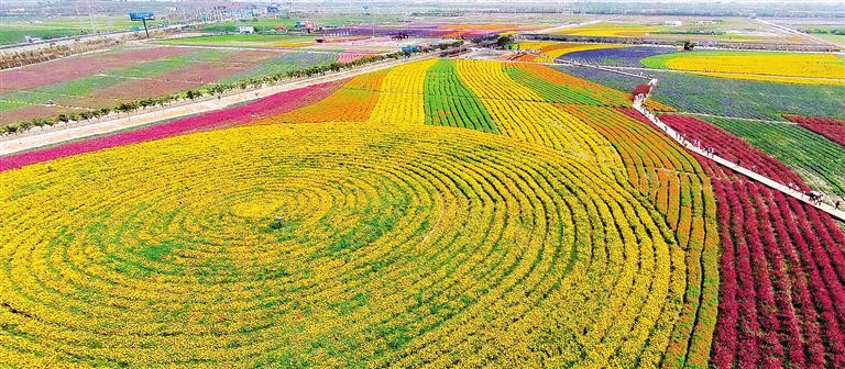金灿灿的万寿菊,多彩的格桑花,有着梦幻紫色的薰衣草……各色的鲜花在这里尽情绽放,将这大片的田野变成了花的海洋。到了这里,人们才真正感受到“乱花渐欲迷人眼”的意境。