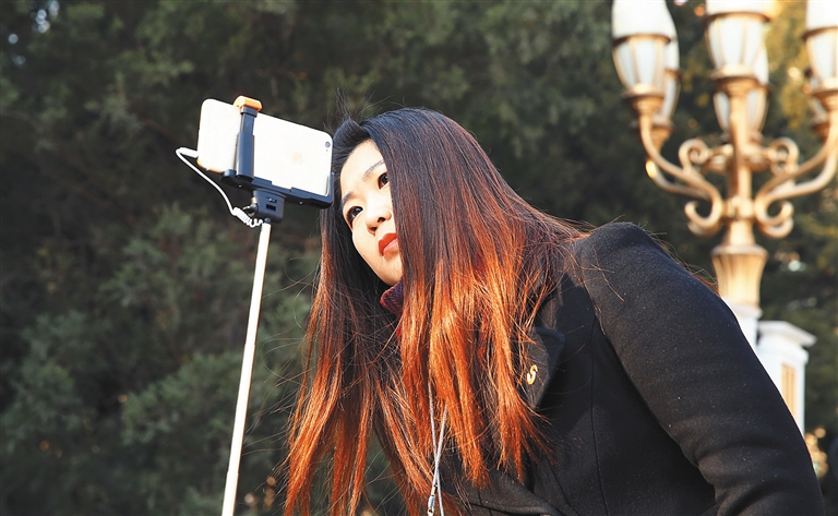 一名女记者利用自拍杆和手机拍延迟视频。