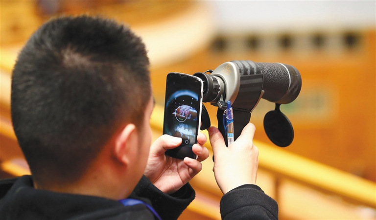 一名记者利用望远镜拍摄两会现场。