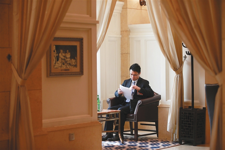 阅读材料 右图:休息时间,住琼全国政协委员朱鼎健在会场外角落里安静阅读会议材料。