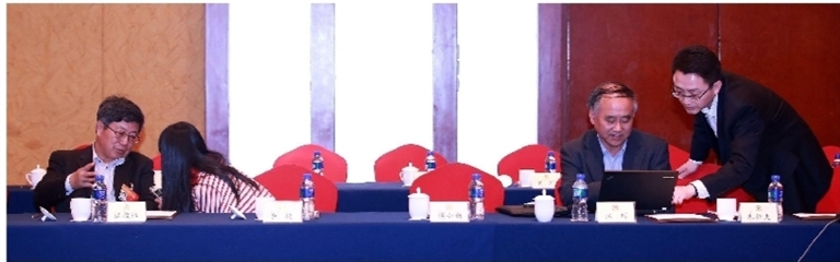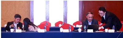 接受采访 核对发言 上图:分组讨论会议散会后,住琼全国政协委员迟福林(左一)在会场接受采访,而张蕴岭委员(右二)在与记录员确认自己发言记录。