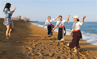 日前,来自四川九寨沟的卓玛三姐妹在琼海市博鳌玉带滩上看到了洁白的沙滩和蓝色的大海,开心地跳起了欢快的藏族锅庄舞。
