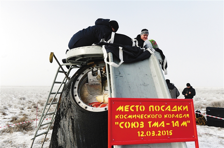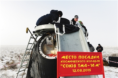 3月12日,在距哈萨克斯坦杰兹卡兹甘东南148公里的地区,工作人员检查飞船返回舱。 俄罗斯地面飞行控制中心12日发布消息说,完成国际空间站驻站任务的3名宇航员当日乘坐“联盟TMA-14M”飞船于莫斯科时间5时08分(北京时间10时08分)在距离哈萨克斯坦南部城市杰兹卡兹甘东南148公里的地区安全着陆。