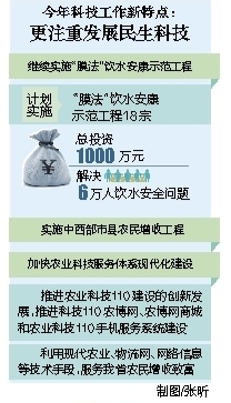 今年科技工作还有一个新特点,就是更加注重发展民生科技。继续实施“膜法”饮水安康示范工程,计划实施“膜法”饮水安康示范工程18宗,总投资1000万元,解决6万人饮水安全问题;实施中西部市县农民增收工程;加快农业科技服务体系现代化建设,不断推进我省农业科技110建设的创新发展,推进科技110农博网、农博网商城和农业科技110手机服务系统建设,利用现代农业、物流网、网络信息等技术手段,服务我省农民增收致富。
