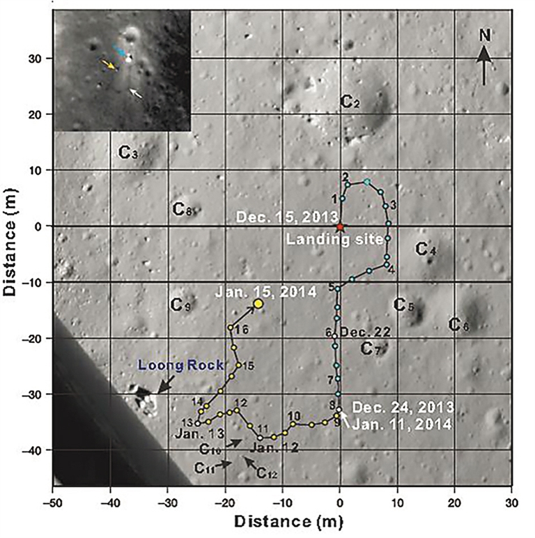 这是由中国地质大学(武汉)肖龙教授团队提供的嫦娥三号着陆点及玉兔行走探测路线图。 科学家对来自中国嫦娥三号着陆器和月球车“玉兔”的数据进行初步分析后发现,月球的地质史比人们此前认为的更为复杂。数据显示,嫦娥三号着陆区表面下至少分为9层结构,这表明在那里曾有多个地质学过程发生,对于探索月球的岩浆演化历史和后期改造作用具有非常重要的意义。这项成果3月12日发表在美国《科学》杂志上,由中国地质大学(武汉)、澳门科技大学、中国科学院电子所、中科院国家天文台和挪威奥斯陆大学等单位共同完成。这是中国嫦娥探月工程实施以来,首次在国际顶级学术期刊上发表科学成果。 新华社发