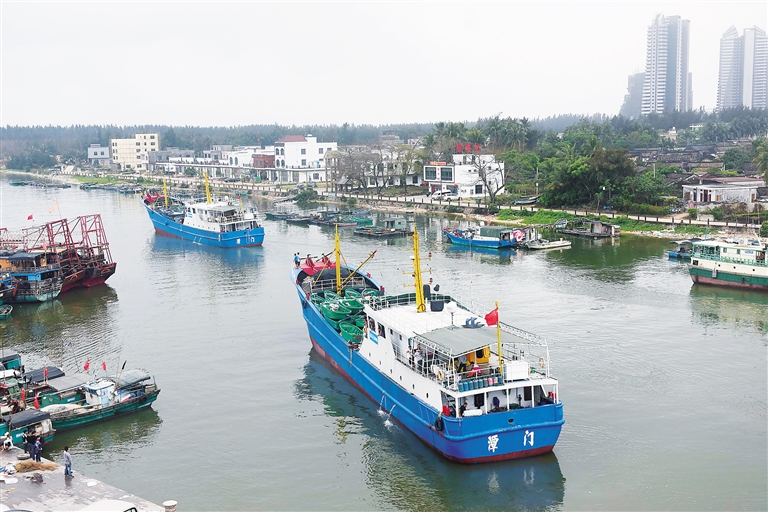 潭门镇第一批29艘500吨级钢船已到港17艘,截至目前已有14艘出海。这些内设雷达、航行报警接收器、避碰机、探鱼器、电台等现代化先进设备的“大家伙”,将更加昂扬地行驶在潭门人的祖宗海。
