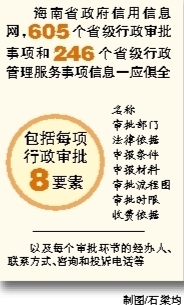 因此,从启动简政放权改革开始,我省就高度重视电子政务的发展。在对全省38个具有行政审批职能的部门和单位所有行政审批事项的全面清理基础上,我省出台了《海南省行政审批目录管理办法》,建立全省统一的行政审批事项目录,也就是政府行政审批的动态“权力清单”,在这个清单之外一律不得实施审批。同时,我省大力推行网上标准化审批,全省建设“一张审批网”和共享大数据库,制定了行政审批业务标准规范,审批流程优化为8类,每个项目审批环节最多不超过4个,并固化在审批系统计算机程序中,减少审批自由裁量权。