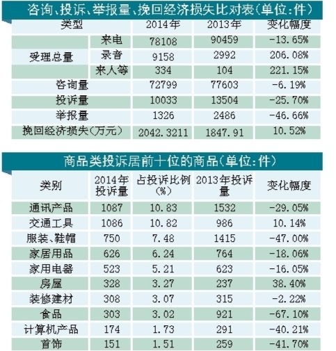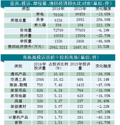 本年度12315受理各类消费者来电87600件,与去年同期比下降6.37%。其中:咨询72799件,同比下降4.63%;投诉10033件,同比下降25.51%;举报1326件,同比下降46.67%。其中,投诉举报案件的办结率为96.99%,为消费者挽回经济损失2042.32万元,同比2013年上升10.52%。