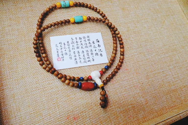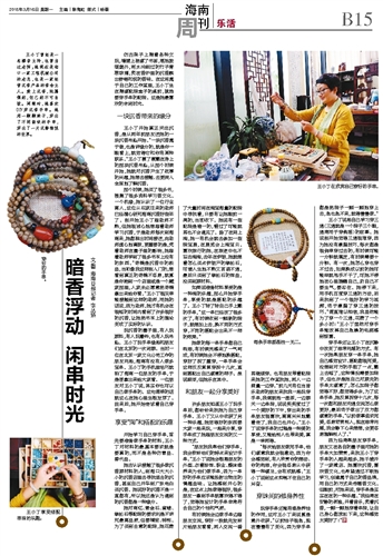 王小丁曾经是一名播音主持,也曾当过老师;她现在是海口一家工程机械公司的老总,也是一家经营沉香产品的香舍主人。爱上沉香,纯属偶然,但已然不可自拔。闲暇时,她喜欢DIY穿沉香手串。她用一颗颗珠子,穿出了不同韵味的手串,穿出了一片沉静愉悦的世界。