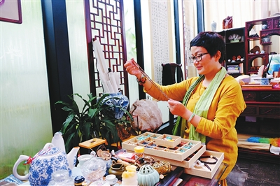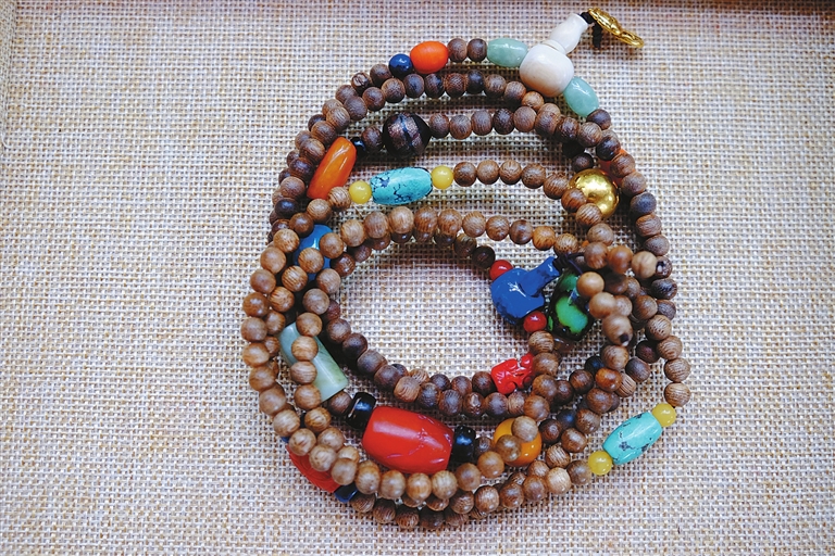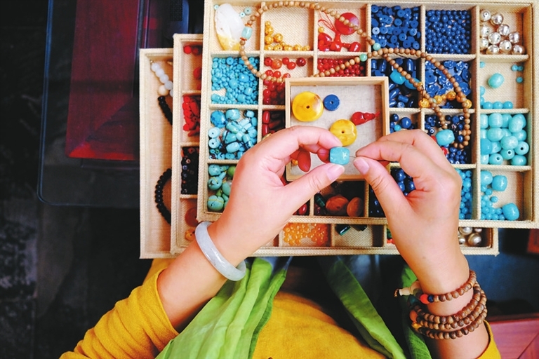 有时候她会边做手串边跟朋友交流,穿好一段就先发照片给朋友看看,两人交流一番再继续穿。也有朋友带着配珠来她的工作室找她,两人一边商量一边穿。“前几天有位当音乐老师的朋友来找我一起玩穿手串,我俩就泡一壶茶,一边聊天一边串珠,说说笑笑度过了一个美好的下午,穿出来的手串朋友很喜欢,高高兴兴地戴着走了,我自己也开心。”王小丁说穿手串的过程是一种美的享受,又能给别人也带来美,真是一举两得。