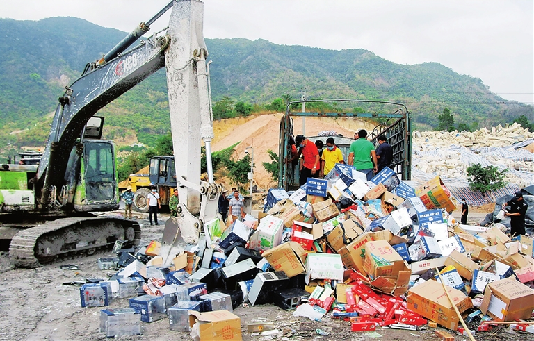 图为活动期间,该局将2014年度罚没的1.3万余件假冒伪劣商品进行填埋销毁。