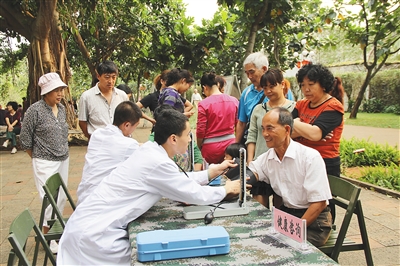 图为官兵在金牛岭公园进行义诊活动。