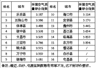 按照城市环境空气质量综合指数(以二氧化硫、二氧化氮、可吸入颗粒物、细颗粒物、臭氧、一氧化碳6项指标进行计算)评价,2015年2月,空气质量排名靠前的5个市县分别是乐东、五指山、保亭、琼中和文昌。现将2015年2月全省除三沙市外的市县城市(镇)环境空气质量排名公告如下。