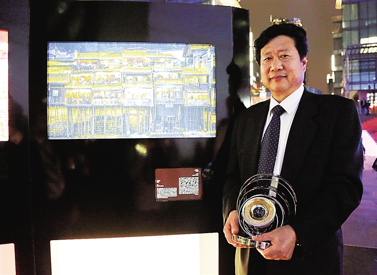 3月16日,在阿联酋迪拜,来自中国大连的摄影师李鹏手捧奖杯站在自己拍摄的作品前。 总奖金达40万美元的第四届迪拜哈姆丹国际摄影大赛16日晚在迪拜国际金融中心揭晓,来自中国江西的摄影师张项理、大连的摄影师李鹏和中国香港的摄影师张志雄分别获得3个单项奖,赛会大奖被印度摄影师安拉格·库玛尔夺得。 新华社记者 李震 摄