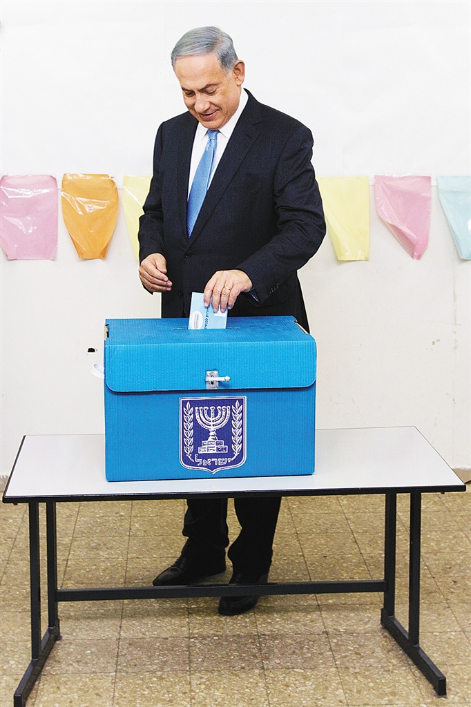 3月17日,以色列总理内塔尼亚胡在耶路撒冷的一处投票站投票。 以色列选民当地时间当日清晨前往投票站投票,开始进行第22届议会选举。 新华社/法新