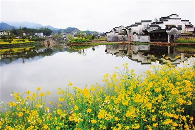 中国画主要以山水为主要内容,以灰白为主要色调,而宏村典型的徽派建筑,粉墙黛瓦马头墙,在波光潋滟的南湖的环绕下,群山、绿树、清流与古居相映成趣,就是一幅绝好的中国画。