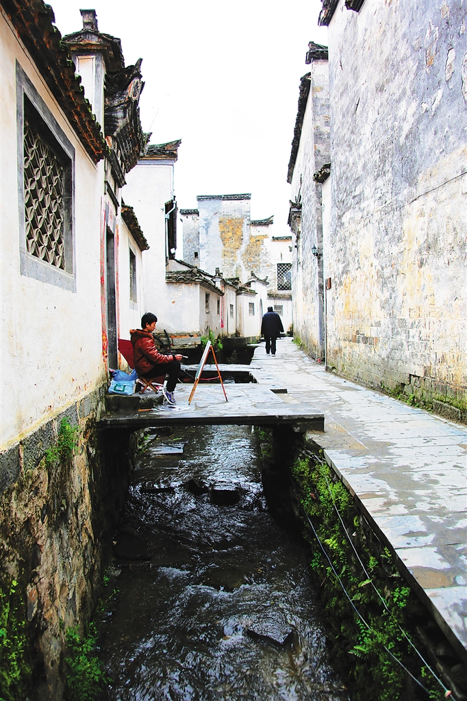 宏村被称为“中国画里的乡村”应该是当代人的推崇。不用说,这样的赞誉还一定与前来宏村写生的人们有关。据说一年四季,来这里写生创作的画家不断,更不用说每年前来实习创作的艺术学院的大学生们了。