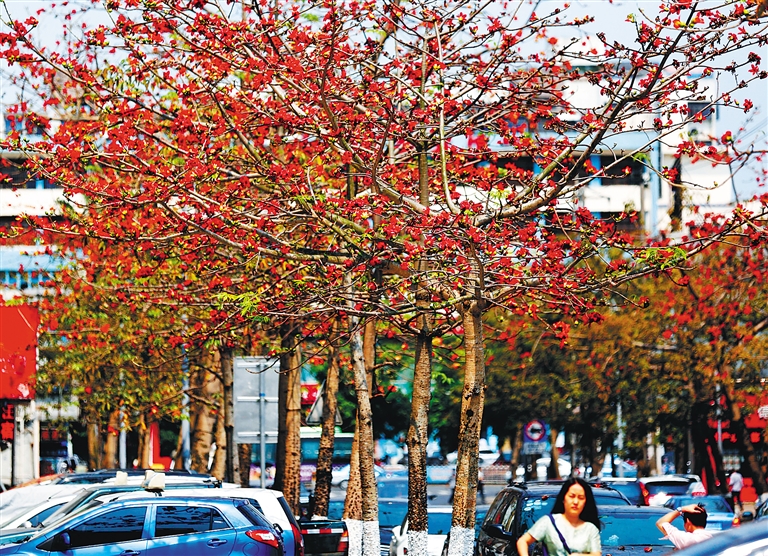 3月17日,在海口市五指山路,街道两边的木棉花开得正艳,成为一道特色风景线,为这座城市绘上浓浓春意。本报记者 陈元才 实习生 陈期财 摄
