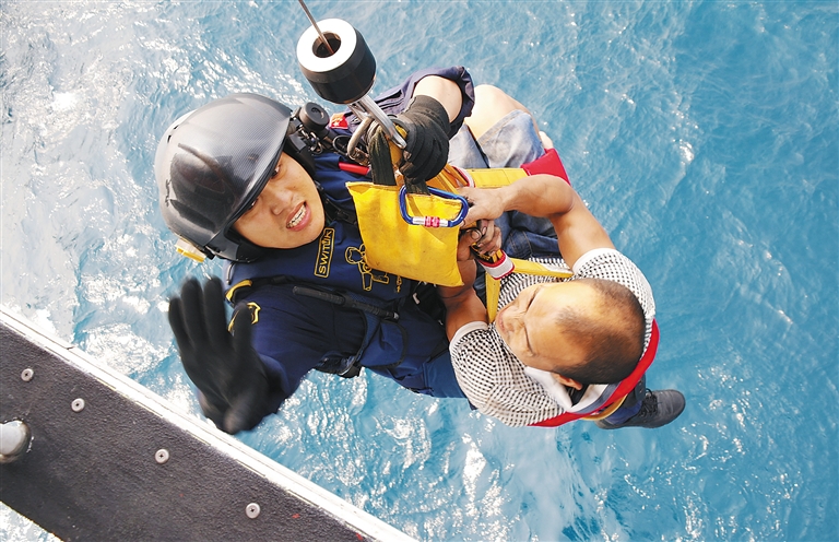 图为南海第一救助飞行队B-7137救助人员通过绞车作业将患病渔民接上直升飞机。