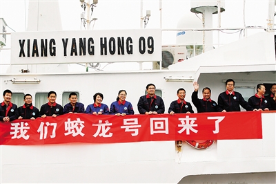 3月17日,“蛟龙”号科考队队员向欢迎人群挥手致意。 当日,“蛟龙”号载人潜水器在西南印度洋完成2014-2015年“蛟龙”号试验性应用航次(中国大洋35航次)科考任务后,搭乘母船靠泊国家深海基地码头。这是“蛟龙”号正式入驻其业务化运行单位,标志着“蛟龙”号业务化运行的陆基保障条件已基本具备。 国家深海基地管理中心位于青岛市所辖即墨市鳌山卫镇,于2013年11月正式开工建设,是多功能、全开放的国家级公共平台,将为开展深海科学研究、深海资源调查提供全方位服务,包括码头作业区、装备维护维修区、潜航员训练区、综合科研办公区、科研仪器海上试验场、水声通信设施区等功能区。