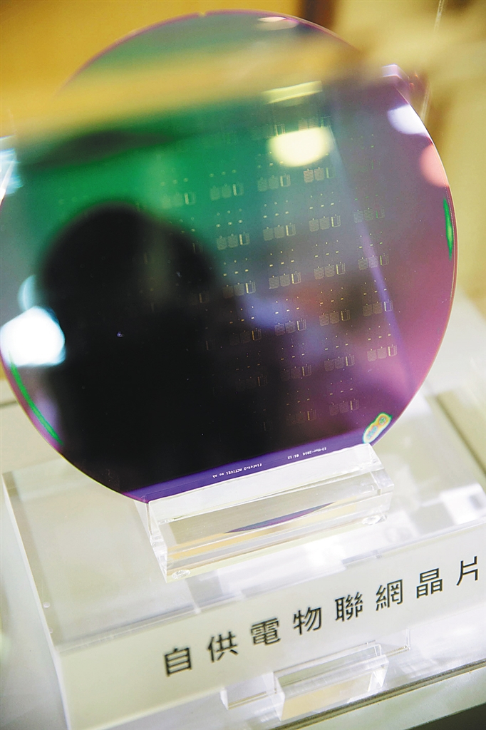 ⬅ 3月17日,一名记者在台北科技大楼拍摄展示的自供电物联网晶片。 当日,台北研究院纳米元件实验室宣布,已开发出可应用于物联网晶片的“一体成行环境光能自供电整合技术”。此技术可采集各种环境光能量,与电池等能源储存装置配合,延长充电周期。经过整合开发之后的感应器,可应用于物联网穿戴式装置。