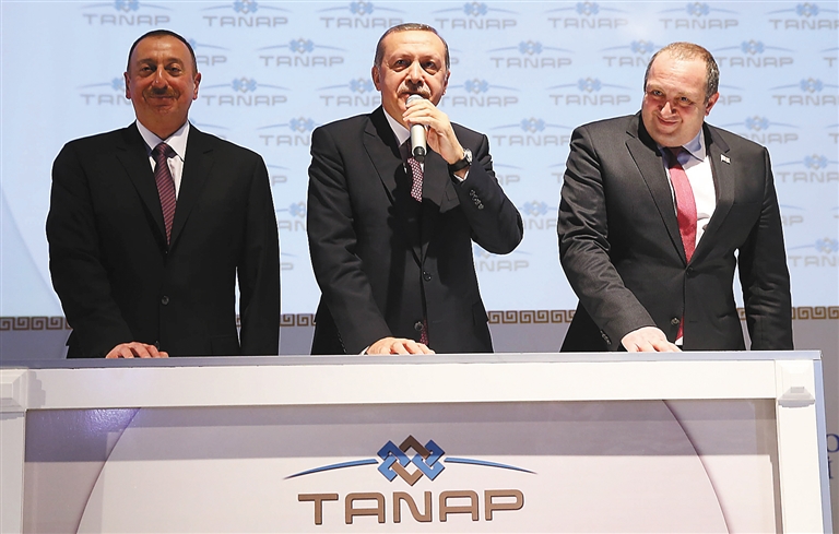 3月17日,在土耳其卡尔斯省,土耳其总统埃尔多安(中)、格鲁吉亚总统马尔格韦拉什维利(右)和阿塞拜疆总统阿利耶夫出席开工仪式。 土耳其、格鲁吉亚和阿塞拜疆17日在土耳其东北部卡尔斯省正式开始建设跨安纳托利亚天然气管道。 根据土耳其和阿塞拜疆签署的政府间协议,跨安纳托利亚天然气管道将阿塞拜疆里海天然气经过格鲁吉亚连接土耳其输送到欧洲国家。该天然气管道建设预计耗资超过100亿美元,将于2018年年底完成。新华社发(梅尔特·玛杰特摄)
