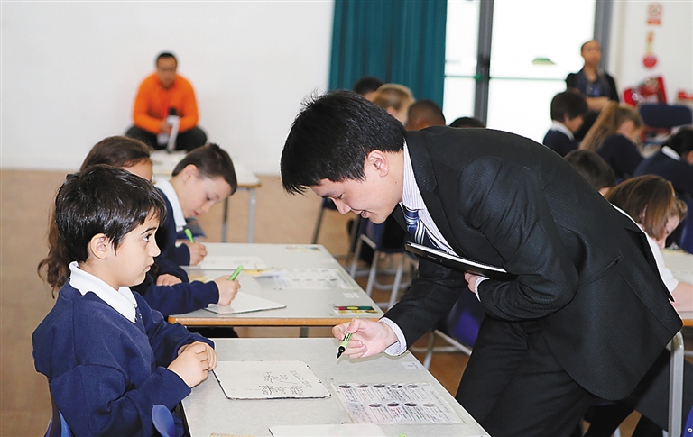 3月17日,在英国伦敦东北部埃塞克斯郡的哈里斯小学,金向军老师为学生批改课堂练习。 当日,来自中国上海徐汇区上海小学的数学老师林磊和金向军为英国伦敦东北部埃塞克斯郡的哈里斯小学的学生们上数学课,教授“九九乘法表”在数学计算中的运用。英国教育部负责学校改革事务的官员尼克·吉布以及约40名小学老师旁听了课程。 新华社记者 韩岩 摄