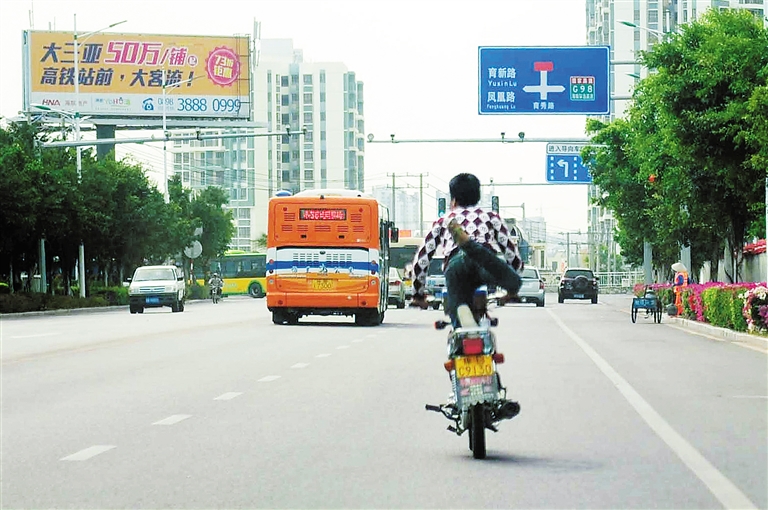 三亚交警提醒,交通安全不可儿戏,这种“玩特技”的骑车方式容易使车辆失控,引发交通事故。